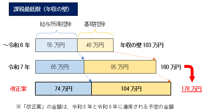昨年(令和7年)の所得税では、給与収入から差し引く「給与所得控除」の最低保障額65万円と、所得から差し引く「基礎控除」の最大額95万円の合計160万円を年収が上回りますと、所得税が発生する仕組みでした。令和8年度の改正法案が成立しますと、「給与所得控除」の最低保障額が65万円から74万円に、「基礎控除」の最大額が95万円から104万円に引き上げられ、これらの合計178万円(改正前:160万円)が課税最低限となります。